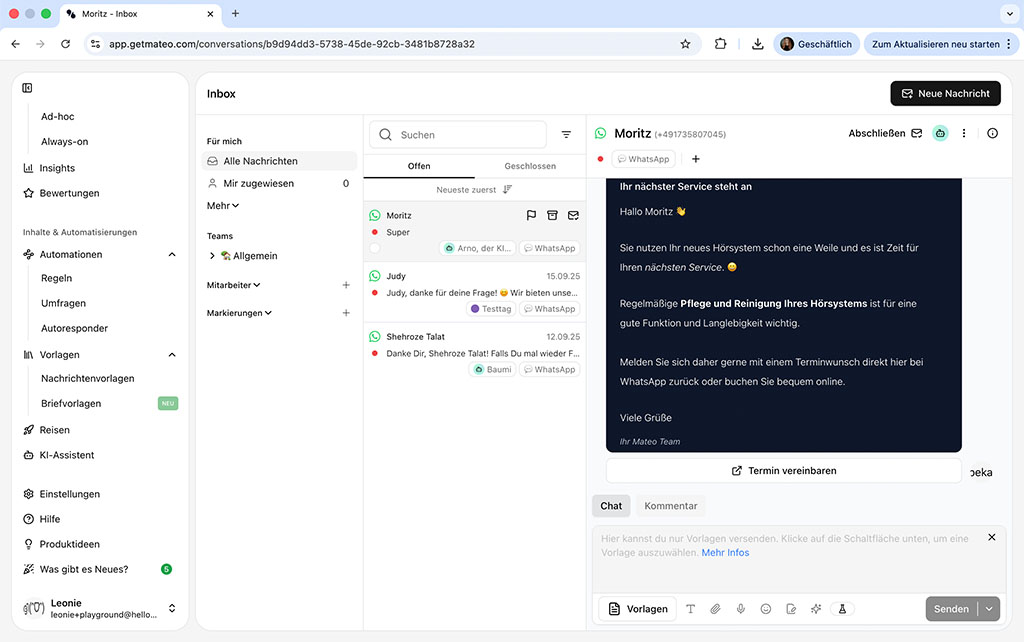 Dabei bleibt es nicht nur beim Versand – auch eingehende Anfragen per Telefon und Chat werden direkt von Mateo beantwortet. Er führt eigenständig Prozesse wie Terminbuchungen oder Kundendienstvorerfassungen aus und sorgt so für einen reibungslosen Ablauf im digitalen Alltag.